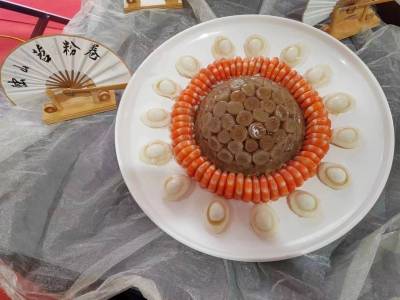 “苕粉坨炒肉”是清朝道光年间,黄梅县一位厨师为纪念“红薯之父”陈振龙而做的一道菜。“苕”是黄梅人对“红薯”的俗称,将五花肉洗净切成薄片,苕粉加清水调匀,锅内下菜籽油滑锅倒出留底油,调小火倒入苕粉浆,用筷子快速搅动,待苕粉成粘稠状,滑动炒锅,用锅铲轻拍食材,使其成厚圆饼状,反复翻面,小火慢煎,至熟透,锅切菱形块,软糯可口。下入肉片,炒熟即可。